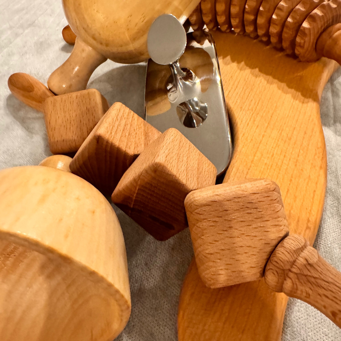 Die Massage wird mit Hilfe anatomisch geformten Holzrollen durchgeführt. Sie wirkt positiv auf das Bindegewebe, auf den Lymphabfluss und auf die Aktivierung von Elastin und Collagen.